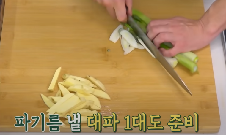 대파는 1대를 어슷 썰고 고구마는 새끼 손가락보다 얇게 썰어주세요.
