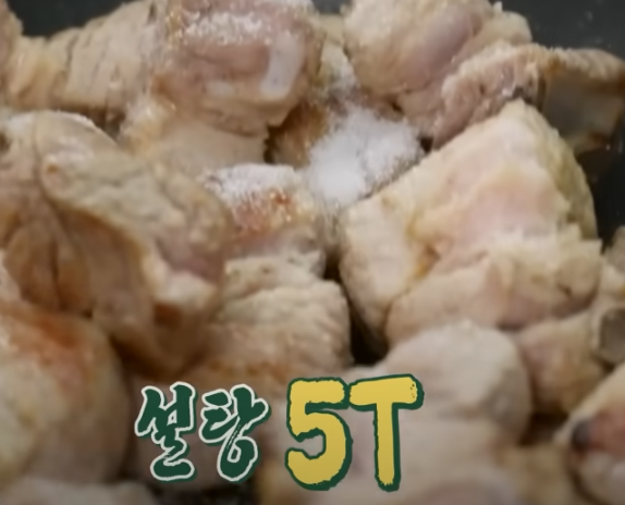 3. 설탕 5T 넣고 볶다가 식초 1T 넣고 볶습니다.